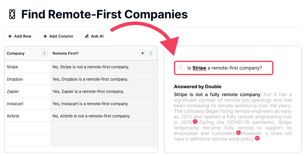 At this point we were not monetizing and although we had a few people using it regularly, the product was very horizontal, it could do a lot of things but was not particularly well suited for anything in particular. So, naturally, the next step was to find out who is most willing to pay for it. At this time, our LLM costs also started creeping up, we brought up a paywall in March 2023, our OpenAI bill was: $7.18 in Dec 2022 $31.46 in Jan 2023 $512.86 in Feb 2023 So it was quickly getting out of hand. After more calls with users, it became clear that sales teams were the group most willing to pay us for our AI spreadsheet, so we started to build workflows and tools specifically for them. We shipped new features that let you import a list of leads onto usedouble.com, find and verify emails for them with 1 button, and enrich the leads with information from throughout the web using simple workflows that required only basic prompting. Later on we added webhooks to push and pull information from your CRM. The most popular tool on usedouble.com was the “Online AI instruction”, which takes your question, turns it into a Google Search query, searches Google, and reads the results, and uses that to provide an answer to your original question with citations. Later on, we built specific scrapers to be able to pull data from LinkedIn, Crunchbase, Google Maps, and other aggregators. You can think of it as Perplexity AI, but in bulk, as shown below.
