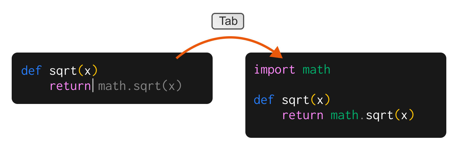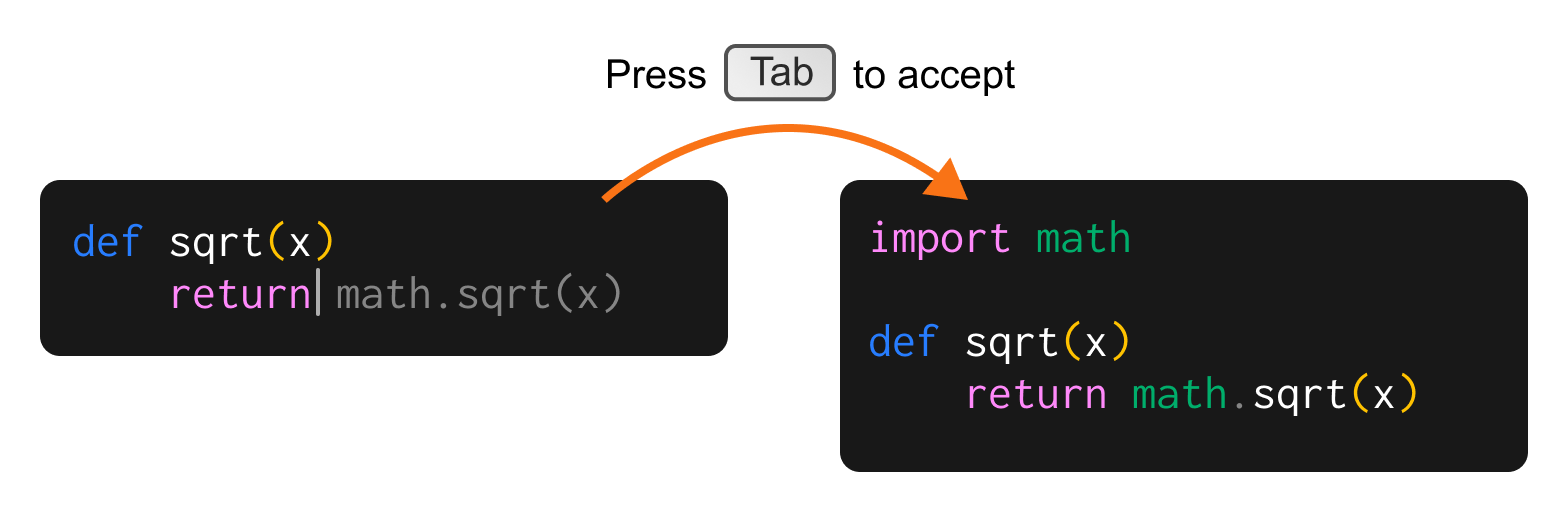 Tab to accept a suggestion and incorporate it into your code. The suggestions are based on the contents of your current file, as well as the libraries you have imported.
