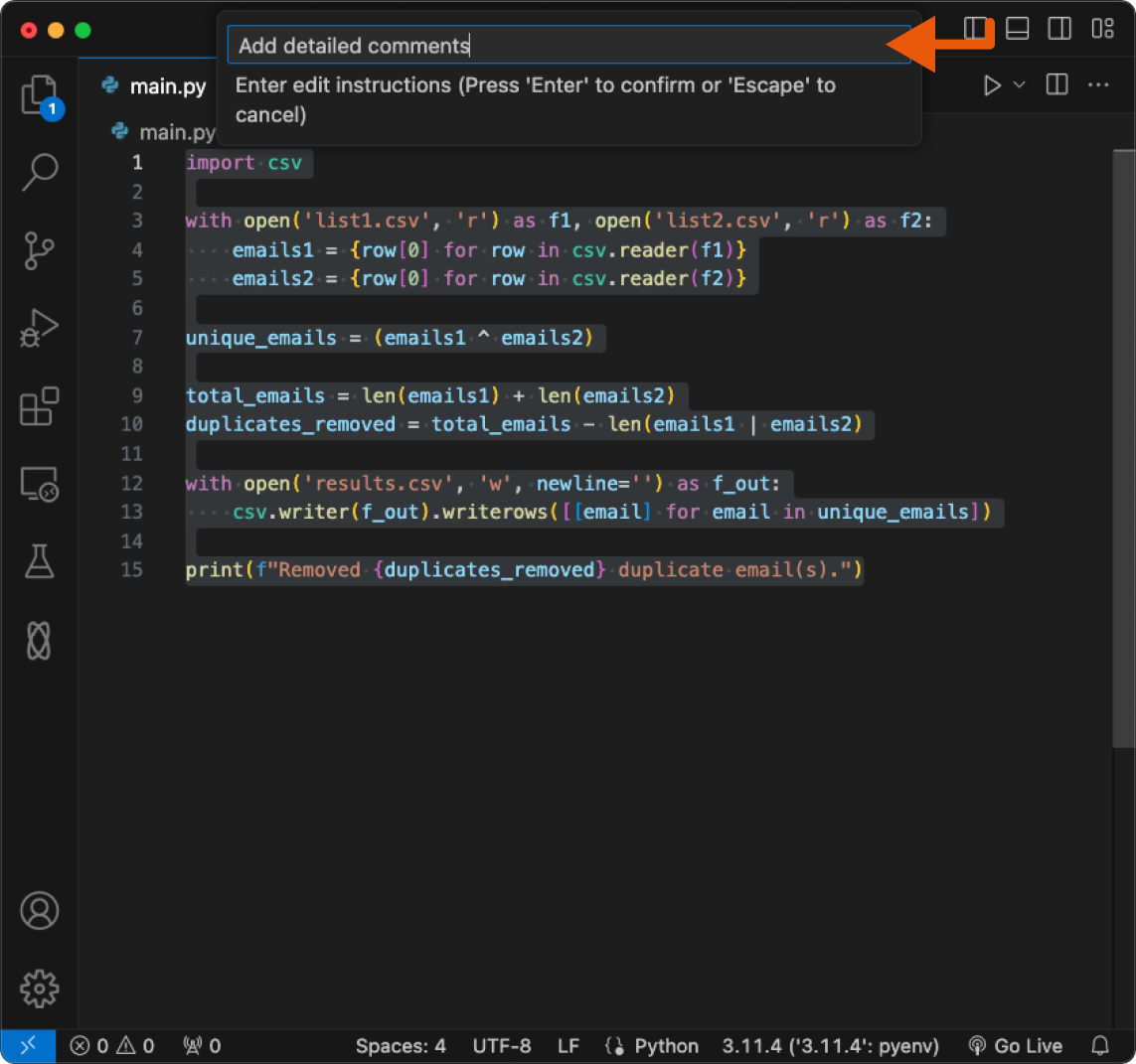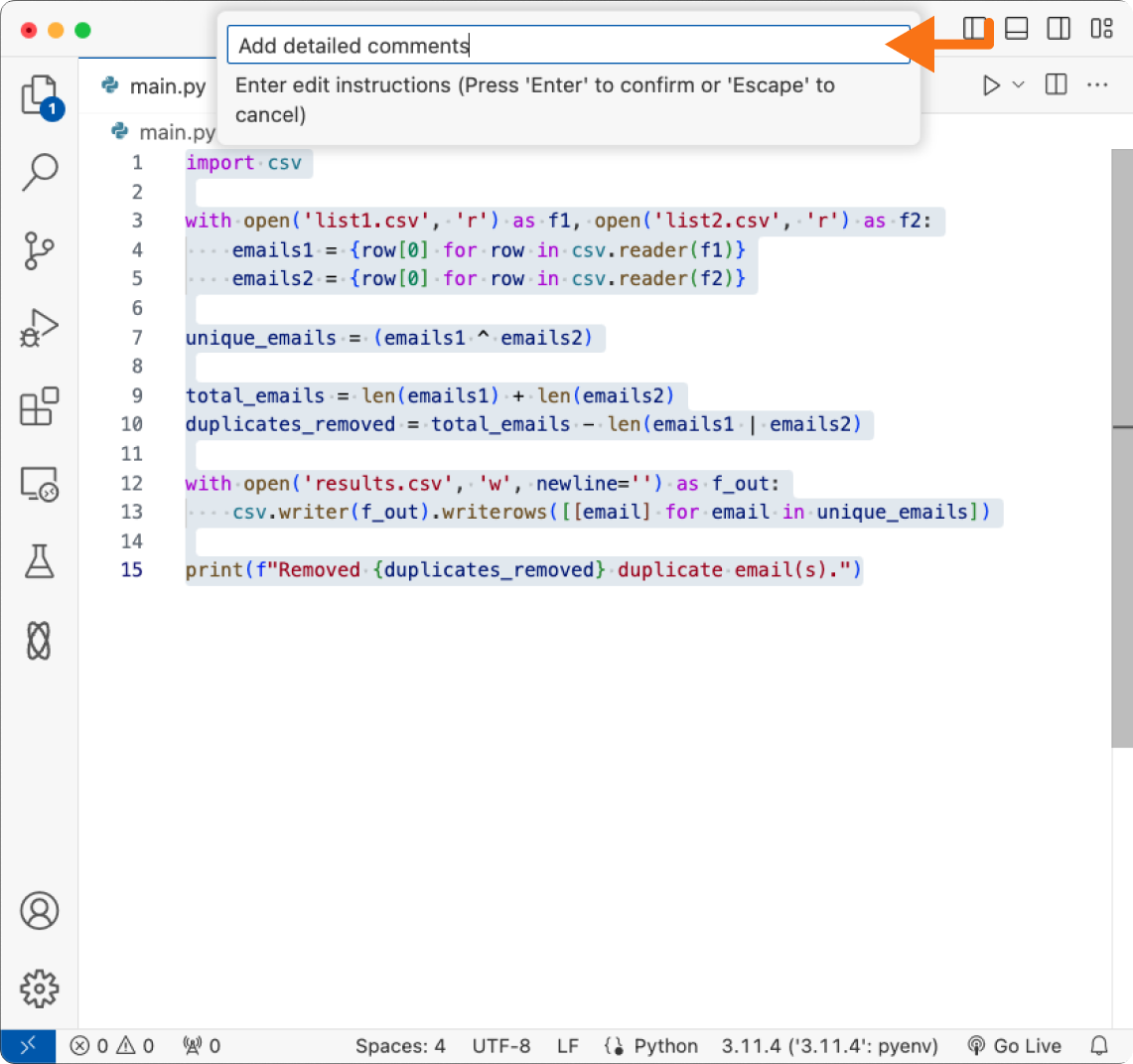Option+O (Mac) or Alt+O (Windows) to trigger an Inline Edit.Give your instructions to Double
