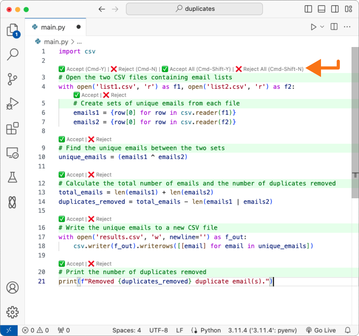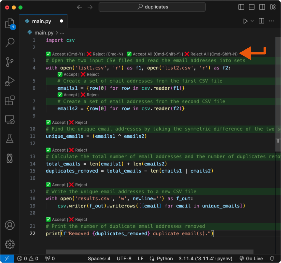 Accept All or Reject All buttons at the top of the editor, or with the Cmd+Shift+Y and Cmd+Shift+N keyboard shortcuts.Alternatively, you can accept or reject individual changes by clicking individually on the Accept or Reject buttons next to each change, or with the Cmd+Y and Cmd+N keyboard shortcut from top to bottom.