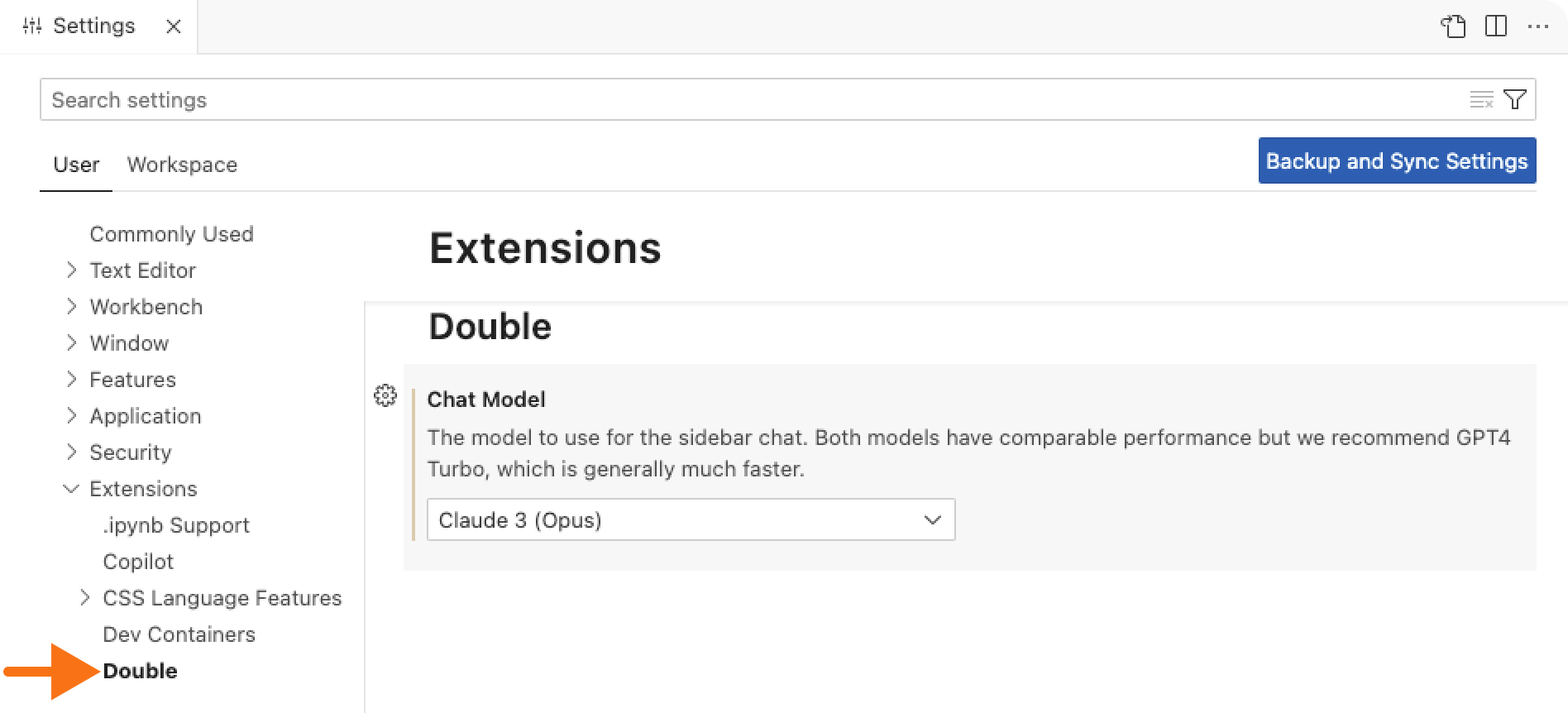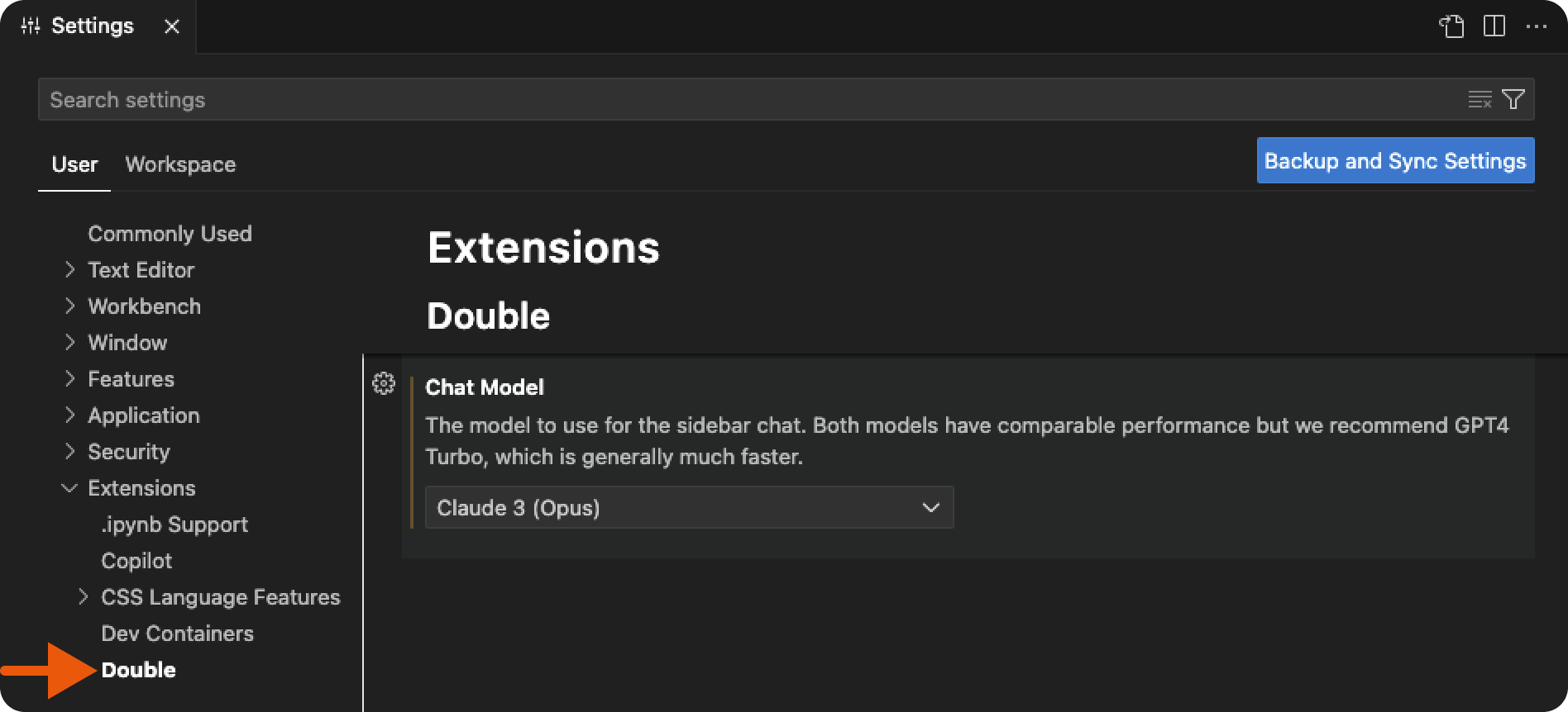 To change what model Double uses, go to the VS Code settings (Cmd + , or Ctrl + ,), expand the Extensions dropdown on the left side of the screen, and select Double. Here you’ll find a dropdown with all of the available models.